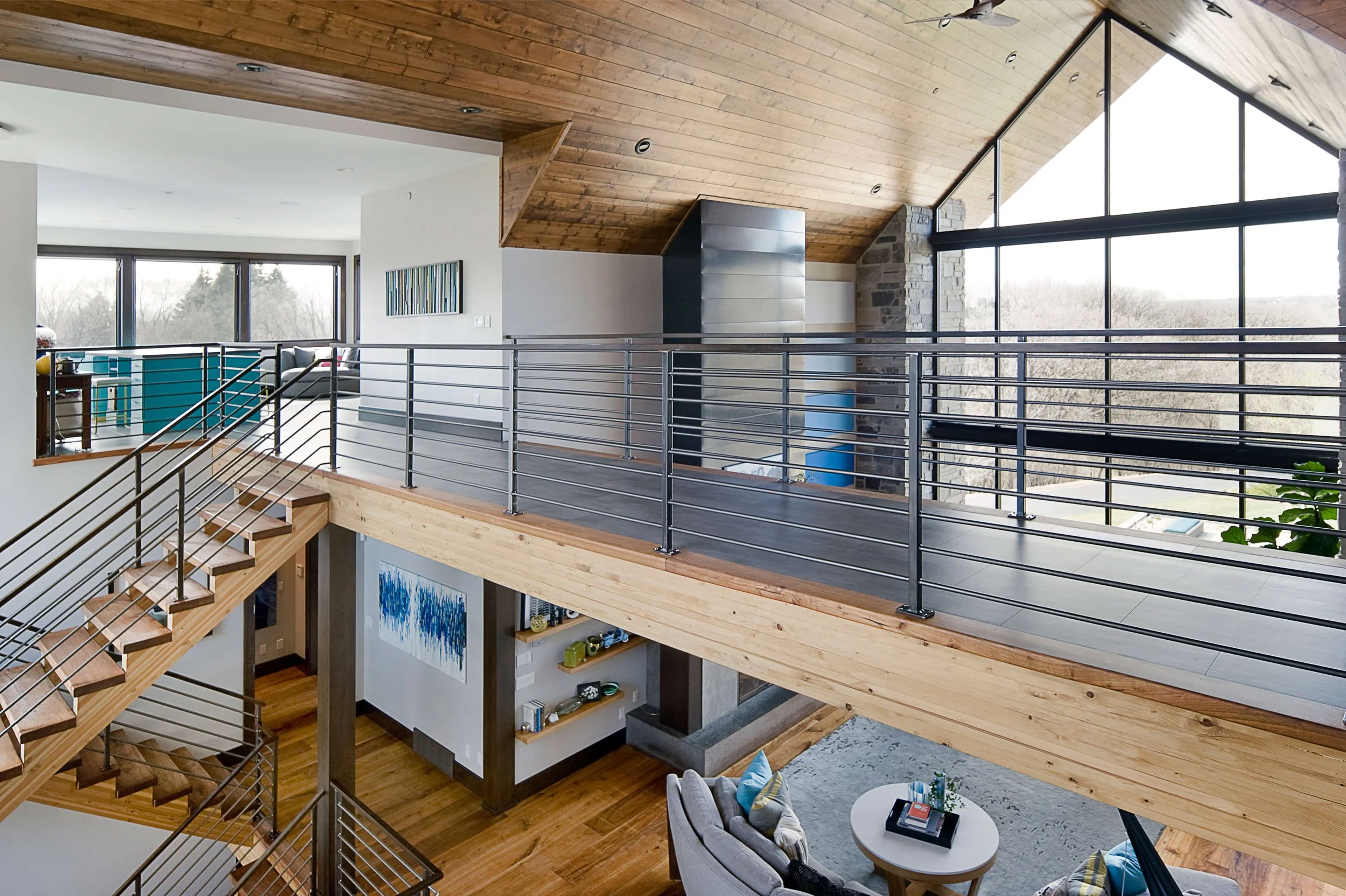 The Oak Hollow Residence is nestled into the forest area near the Tomar Park neighborhood in Sioux, Falls. Perched on a hill and surrounded by trees, this site provided a beautiful back drop for the modern mountain-esque design. The main level of the home features a high vaulted ceiling with an open floor plan. Areas on the main level include the master suite wing, great room, dining and kitchen, large pantry and mudroom, and a hearth room. Upstairs is the kid’s area with a craft area and study room connected by a catwalk overlooking the great room below. Also upstairs are the kids bedrooms, each with a unique painted accent feature. In the lower level there are two additional guest bedrooms as wall as a home bar, additional living room, music area, play room, office and full core floor shop space beneath the garage. Outside of the home there multiple tile decks, both covered and uncovered. Exterior materials include a mixture of stone, artisan siding, metal paneling and wood details.